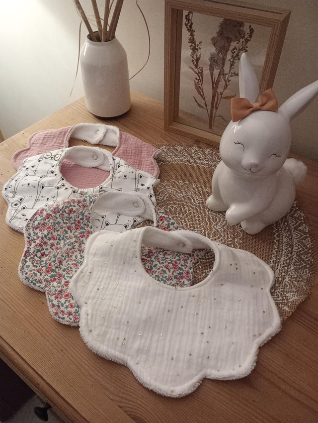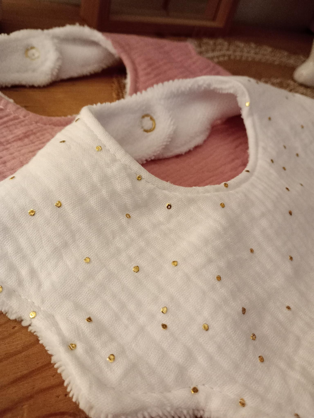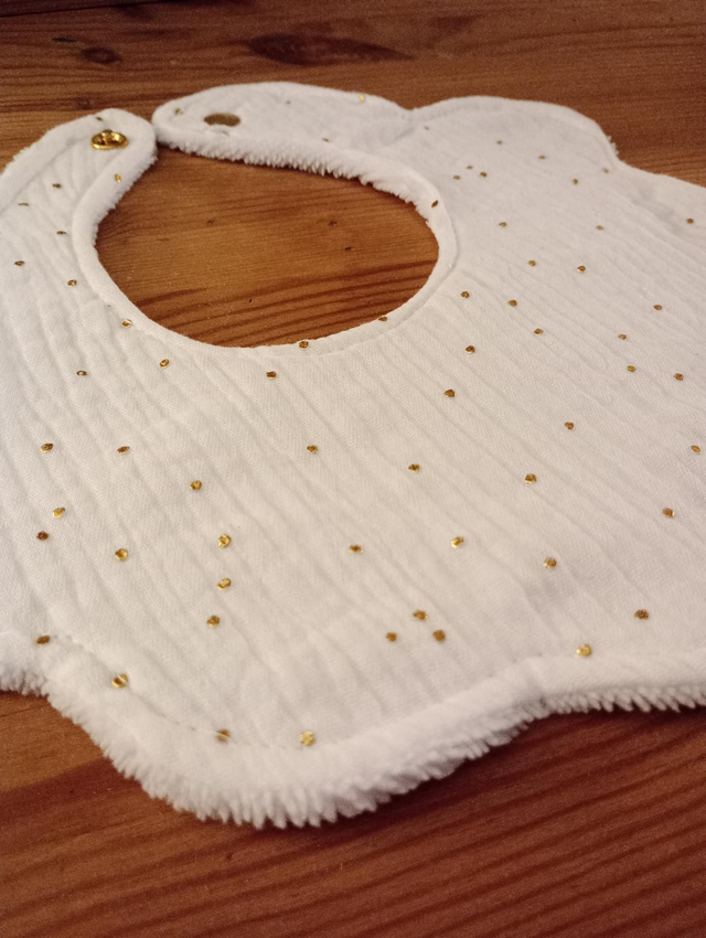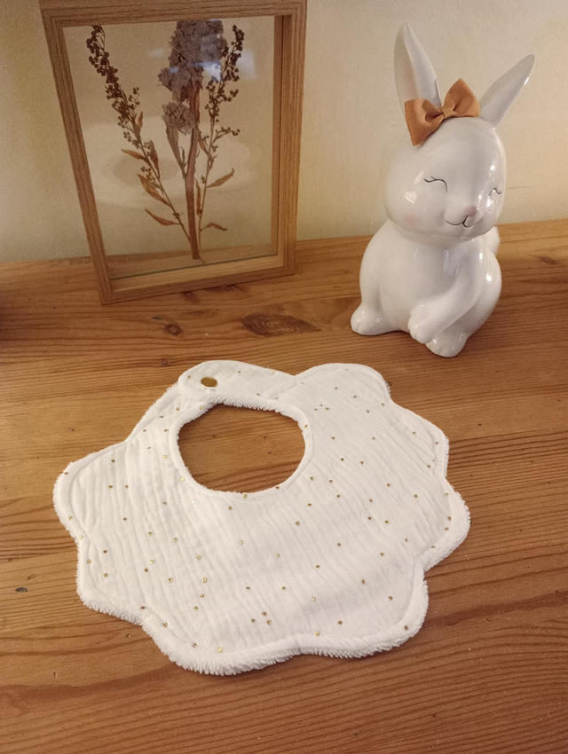 Craquez pour ce bavoir en forme de fleur, confectionné à la main avec amour dans mon atelier. Doux, pratique et plein de charme, il est orné d’un motif à pois doré adorable qui ravira petits et grands. Idéal pour les premiers repas de bébé ou simplement pour baver avec style !