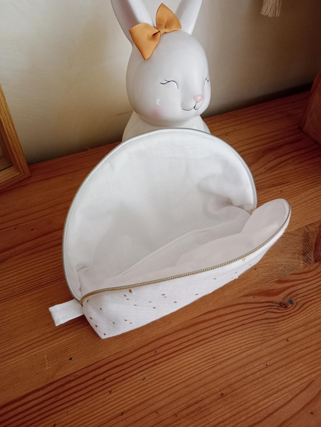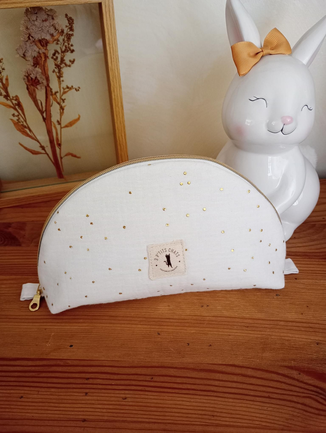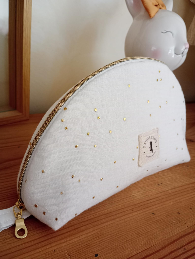 Apportez une touche de douceur et dâĂ©lĂ©gance Ă votre quotidien avec cette jolie trousse demi-lune faite main. ConfectionnĂ©e en gaze de coton double Ă©paisseur et parsemĂ©e de pois dorĂ©s dĂ©licats, elle est idĂ©ale pour ranger votre maquillage, vos stylos, vos petits accessoires ou vos indispensables de voyage.